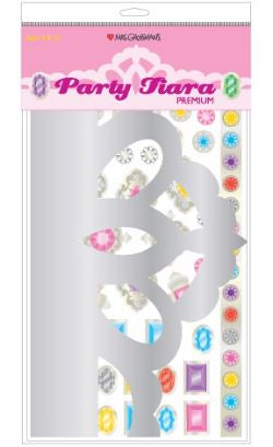 This elegant tiara made of shiny silver, heavy paper stock, is the perfect party favor for kids of all ages, Included is a sheet of sparkling sticker jewels to decorate your one of a kind tiara. One tiara per package. 4" tall